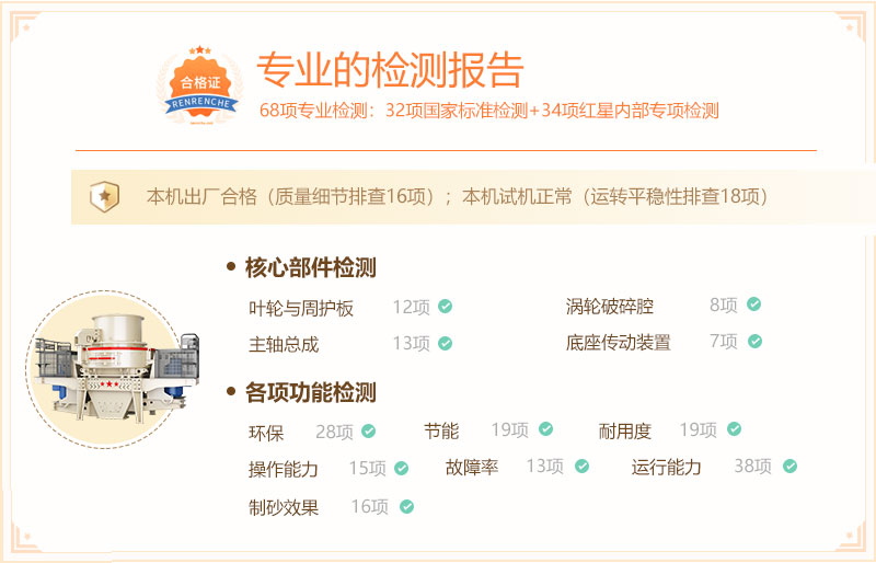 檢驗(yàn)結(jié)果:經(jīng)專業(yè)檢測,該設(shè)備無論是核心部件還是各項(xiàng)功能均達(dá)標(biāo),并表現(xiàn)非常良好,核心零部件結(jié)實(shí)耐用、壽命長;日常操作靈活便捷、故障少,且具有效能高、高產(chǎn)、節(jié)能、環(huán)保、成品效果好等諸多亮點(diǎn)。設(shè)備綜合情況非常不錯,符合現(xiàn)代化石料廠需求設(shè)備標(biāo)準(zhǔn)。詳細(xì)的報告細(xì)節(jié)如下: