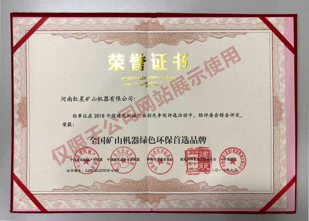 為順應(yīng)綠色礦山時(shí)代發(fā)展需要,結(jié)合客戶實(shí)際現(xiàn)場需求,紅星一直在設(shè)備研發(fā)路上奮進(jìn),被評(píng)為“全國礦山機(jī)器綠色環(huán)保首選品牌”。查看證書